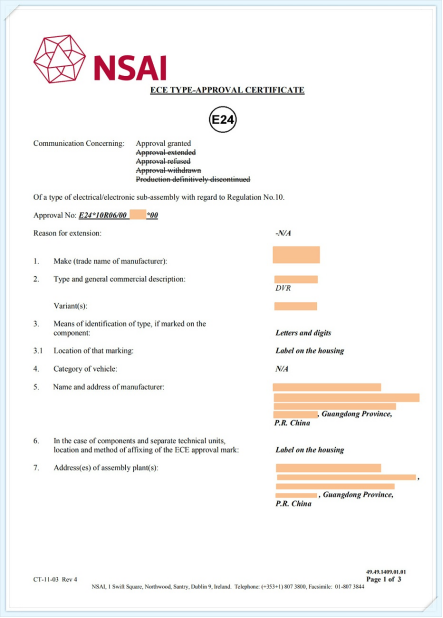 F:报告审核无误后,交通部正式签发产品E-mark认证证书